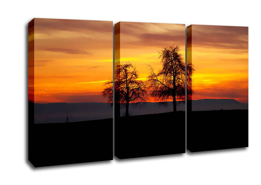 English Countryside At Daybreak 3 Panel Canvas Print handmade in the UK. Stretched over a 2 inch thick wooden box frame, ready to hang on your wall.