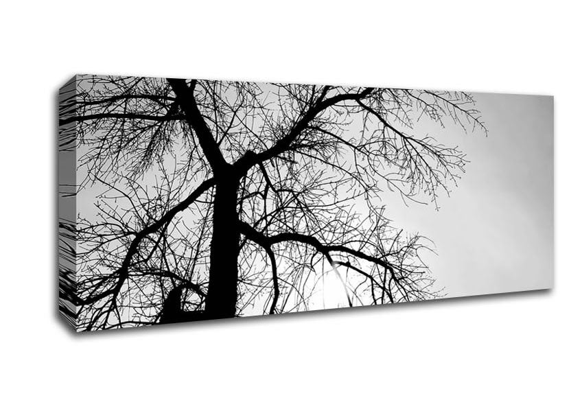Winter Branches In The Sun B n W Panoramic Canvas Print handmade in the UK. Stretched over a 2 inch thick wooden box frame, ready to hang on your wall.