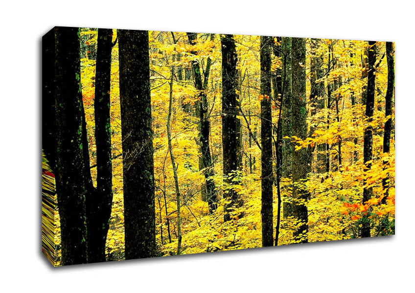 Yellow Woodland Wide Canvas Print handmade in the UK. Stretched over a 2 inch thick wooden box frame, ready to hang on your wall.
