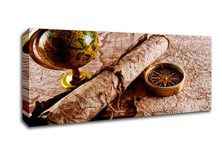Old Maps And Compass With Globe Panoramic Canvas Print handmade in the UK. Stretched over a 2 inch thick wooden box frame, ready to hang on your wall.