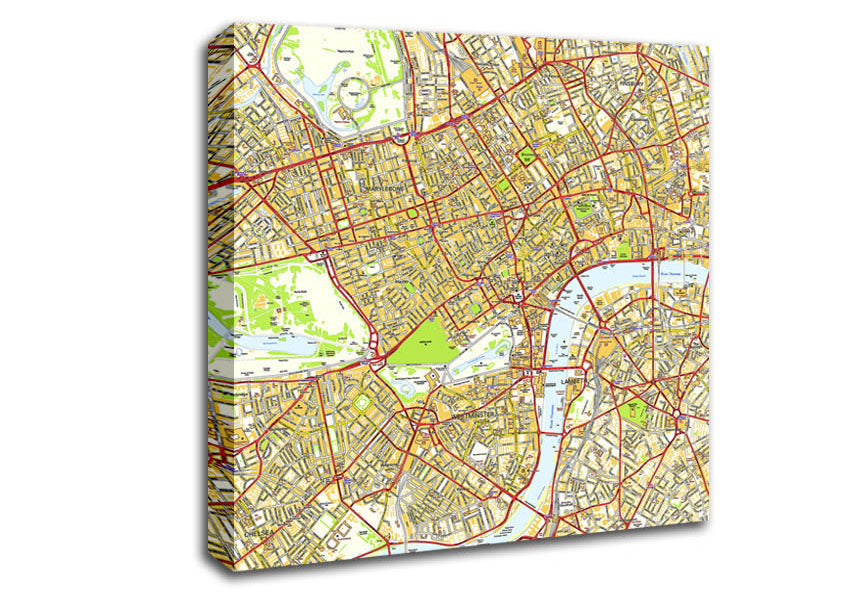 Map Of London Square Canvas Print handmade in the UK. Stretched over a 2 inch thick wooden box frame, ready to hang on your wall.