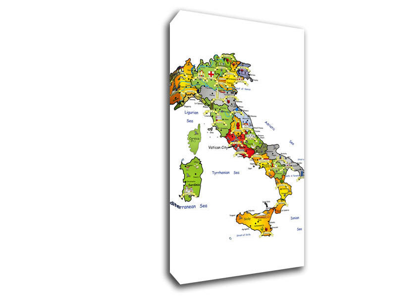 Travel Map Of Italy Wide Canvas Print handmade in the UK. Stretched over a 2 inch thick wooden box frame, ready to hang on your wall.