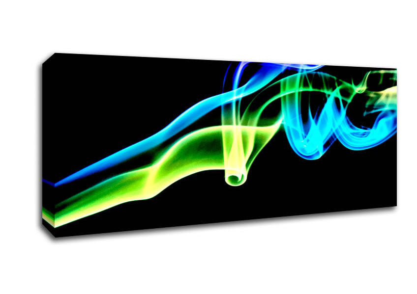 Vibrant Smoke Trail On Black Panoramic Canvas Print handmade in the UK. Stretched over a 2 inch thick wooden box frame, ready to hang on your wall.