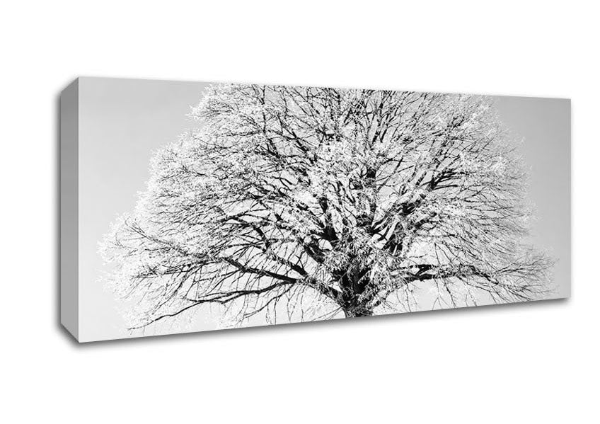 Winter Snow Tree B n W Panoramic Canvas Print handmade in the UK. Stretched over a 2 inch thick wooden box frame, ready to hang on your wall.