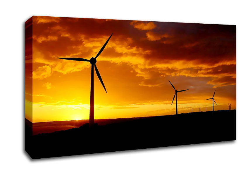 Windmills At Sunlight Wide Canvas Print handmade in the UK. Stretched over a 2 inch thick wooden box frame, ready to hang on your wall.