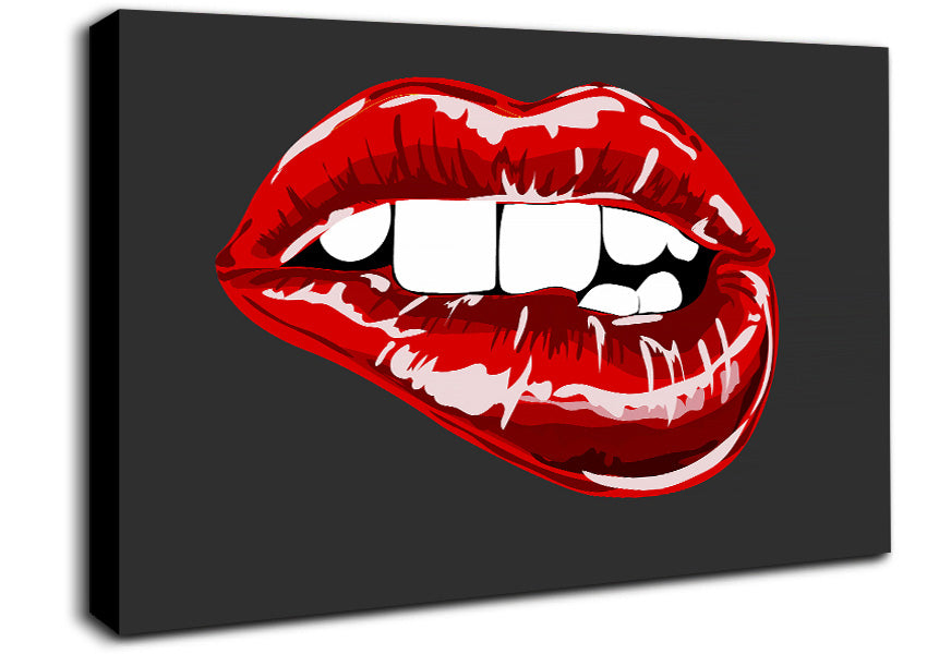 Red Lip Bite On Grey Canvas Print handmade in the UK. Stretched over a 2 inch thick wooden box frame, ready to hang on your wall.
