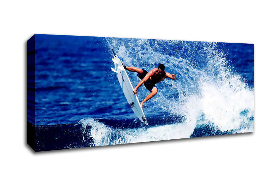 Surfer Jumping The Wave Panoramic Canvas Print handmade in the UK. Stretched over a 2 inch thick wooden box frame, ready to hang on your wall.