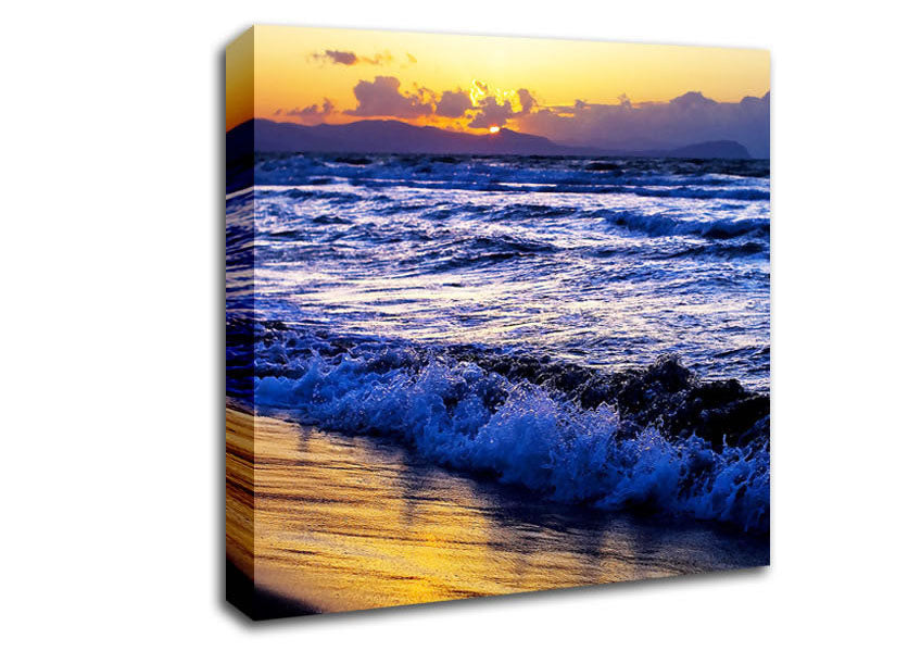 The Ocean Colours At Twilight Square Canvas Print handmade in the UK. Stretched over a 2 inch thick wooden box frame, ready to hang on your wall.