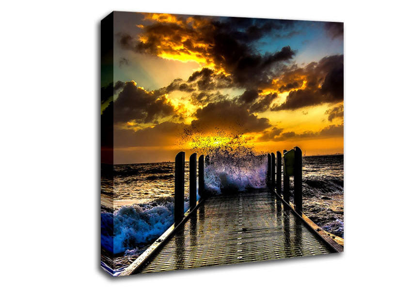 Waves Crashing On The Pier At Sunset Square Canvas Print handmade in the UK. Stretched over a 2 inch thick wooden box frame, ready to hang on your wall.