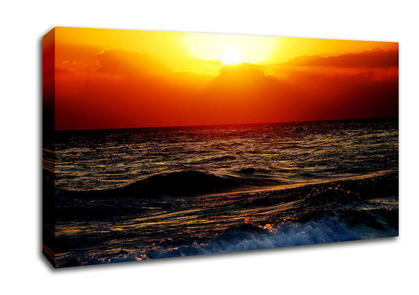 Blazing Sun Over The Crystal Ocean Wide Canvas Print handmade in the UK. Stretched over a 2 inch thick wooden box frame, ready to hang on your wall.