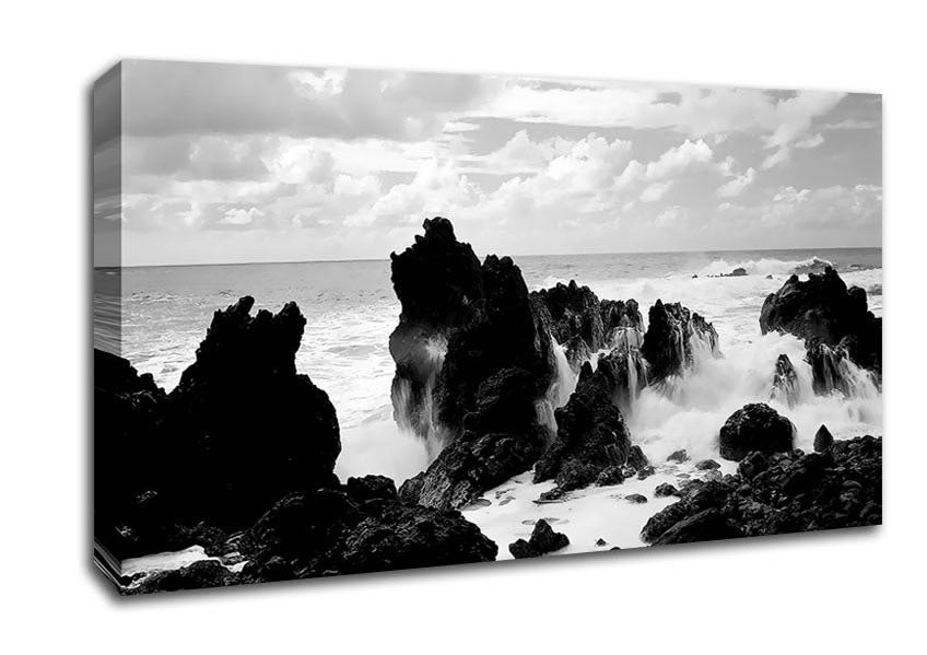 Crashing Waves Over Rocks B n W Wide Canvas Print handmade in the UK. Stretched over a 2 inch thick wooden box frame, ready to hang on your wall.