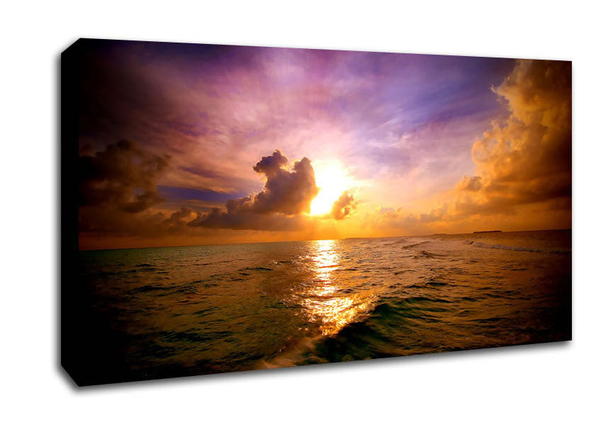 Maldivian Sunset Wide Canvas Print handmade in the UK. Stretched over a 2 inch thick wooden box frame, ready to hang on your wall.