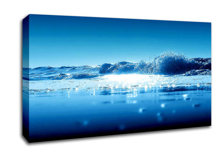 Sparkling Blue Ocean Wave Wide Canvas Print handmade in the UK. Stretched over a 2 inch thick wooden box frame, ready to hang on your wall.
