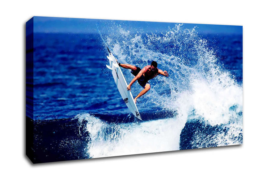 Surfer Jumping The Wave Wide Canvas Print handmade in the UK. Stretched over a 2 inch thick wooden box frame, ready to hang on your wall.