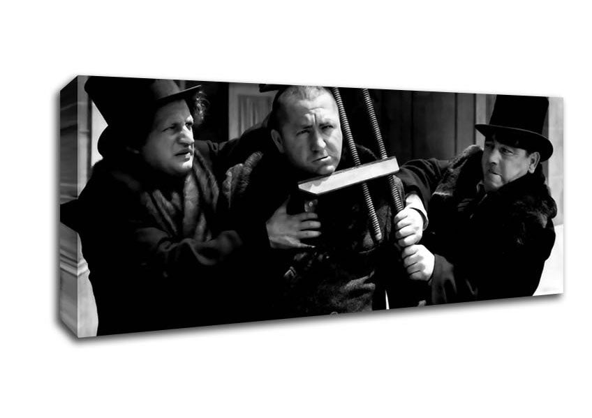 The Three Stooges Head Clamp Panoramic Canvas Print handmade in the UK. Stretched over a 2 inch thick wooden box frame, ready to hang on your wall.