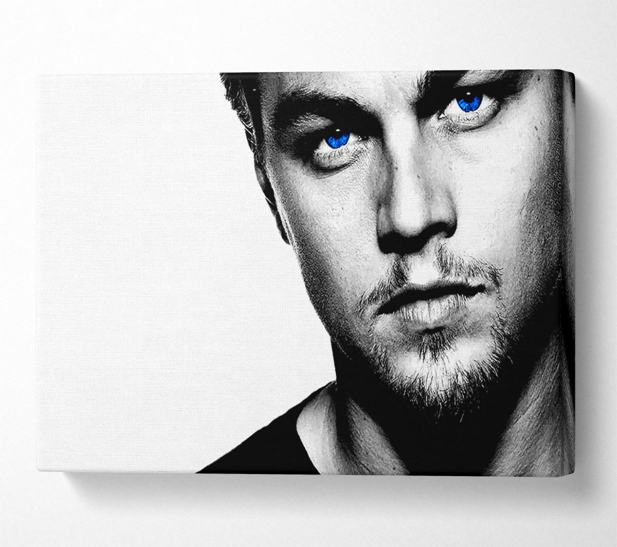 Leonardo Dicaprio Blue Eyes B n W Canvas Print handmade in the UK. Stretched over a 2 inch thick wooden box frame, ready to hang on your wall.
