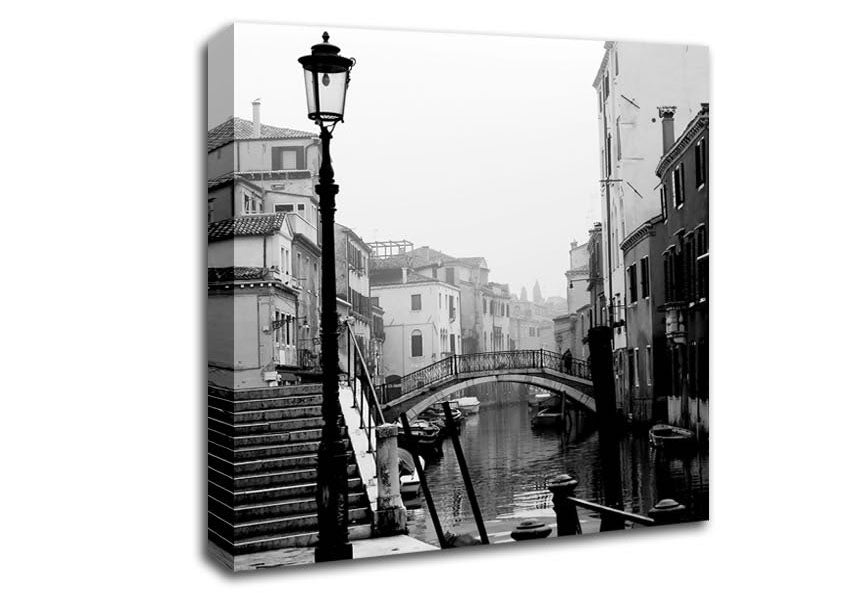 Venice Retro B n W Square Canvas Print handmade in the UK. Stretched over a 2 inch thick wooden box frame, ready to hang on your wall.