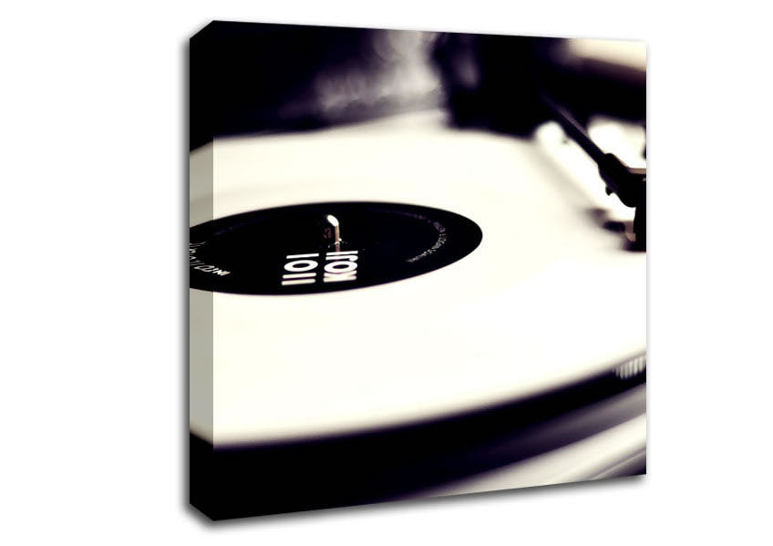 Vinyl Record Player Black And White Square Canvas Print handmade in the UK. Stretched over a 2 inch thick wooden box frame, ready to hang on your wall.