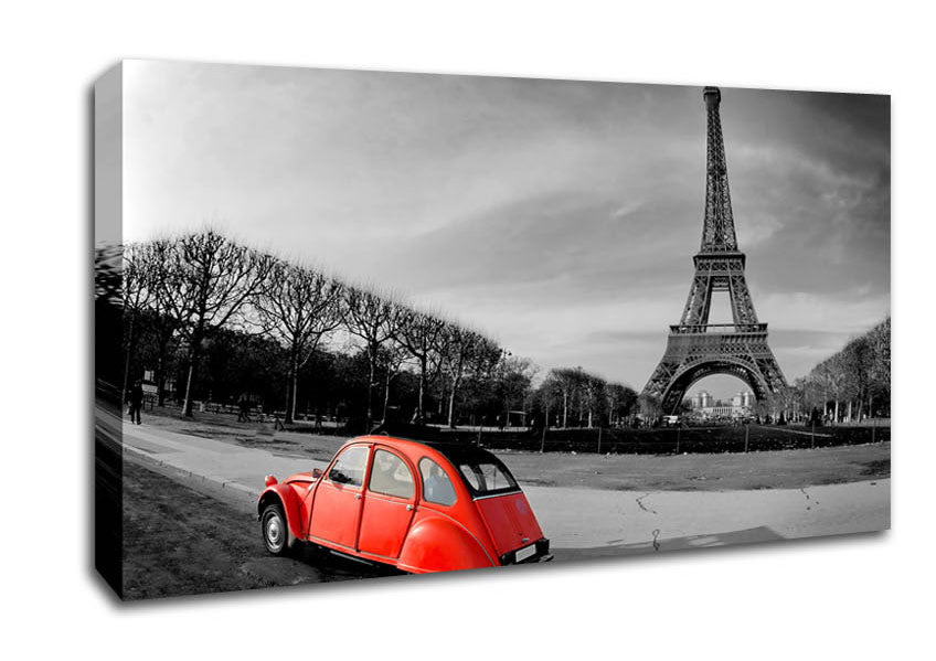 Red Car-Eiffel Tower Paris Wide Canvas Print handmade in the UK. Stretched over a 2 inch thick wooden box frame, ready to hang on your wall.