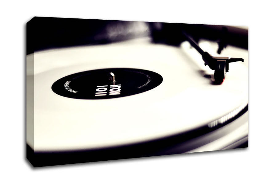 Vinyl Record Player Black And White Wide Canvas Print handmade in the UK. Stretched over a 2 inch thick wooden box frame, ready to hang on your wall.
