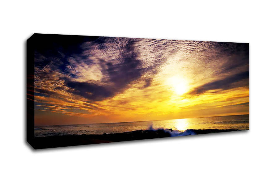 Yellow Ocean Sunblaze Panoramic Canvas Print handmade in the UK. Stretched over a 2 inch thick wooden box frame, ready to hang on your wall.