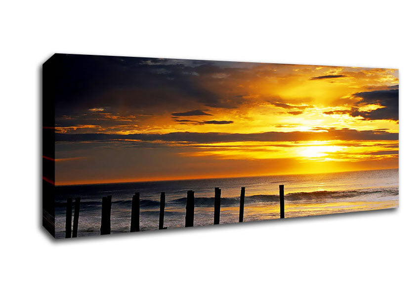Yellow Sunrise Ocean Panoramic Canvas Print handmade in the UK. Stretched over a 2 inch thick wooden box frame, ready to hang on your wall.