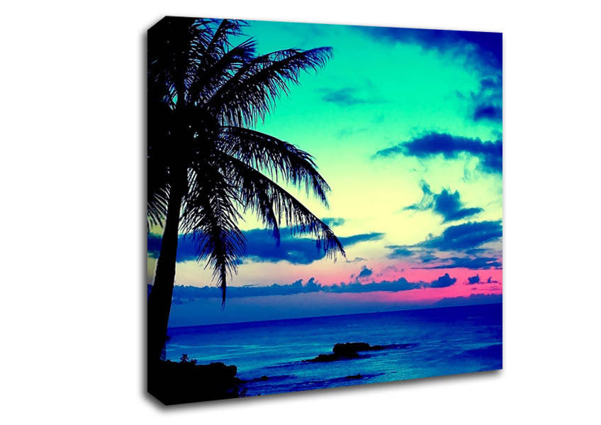 Tropical Sunrise Square Canvas Print handmade in the UK. Stretched over a 2 inch thick wooden box frame, ready to hang on your wall.