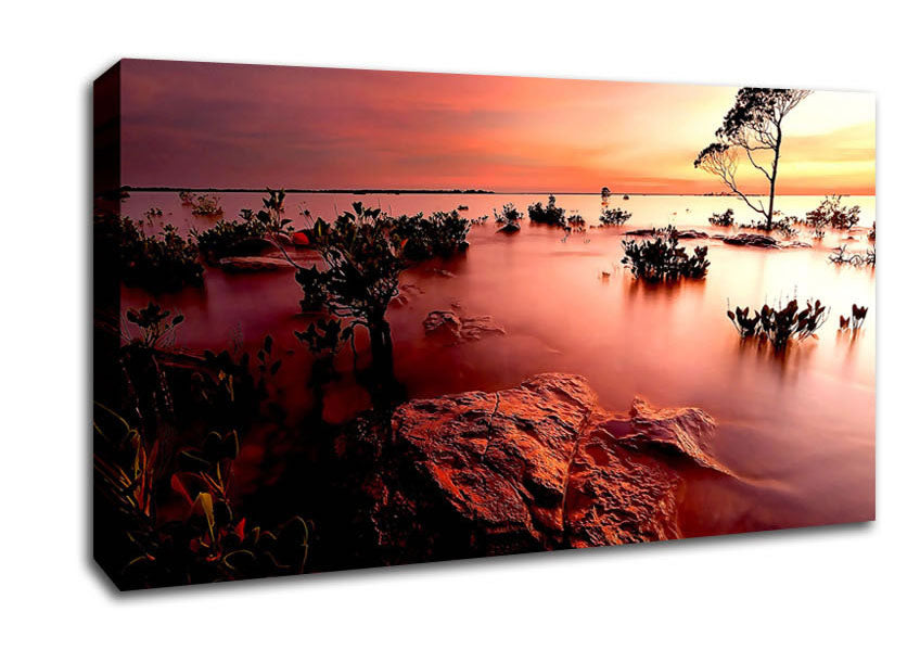 Tranquil Pink Ocean Trees Wide Canvas Print handmade in the UK. Stretched over a 2 inch thick wooden box frame, ready to hang on your wall.