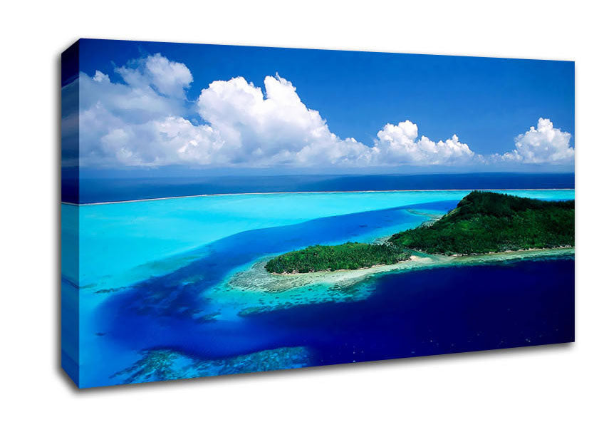 Turquoise Island Paradise Wide Canvas Print handmade in the UK. Stretched over a 2 inch thick wooden box frame, ready to hang on your wall.