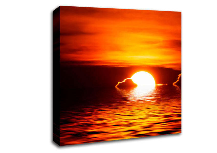 The Sun Falls In The Ocean Square Canvas Print handmade in the UK. Stretched over a 2 inch thick wooden box frame, ready to hang on your wall.