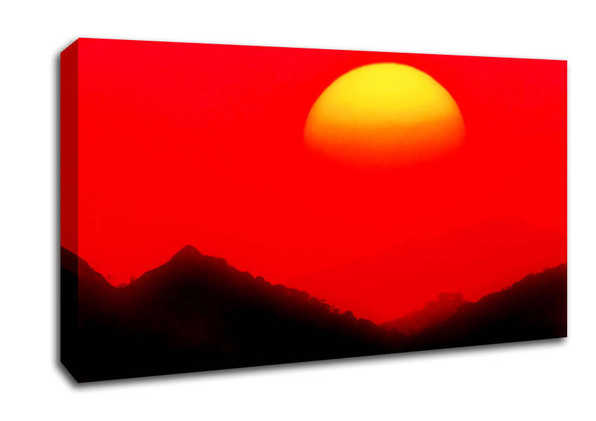 Huge Sun Over The Mountain Tops Red Wide Canvas Print handmade in the UK. Stretched over a 2 inch thick wooden box frame, ready to hang on your wall.