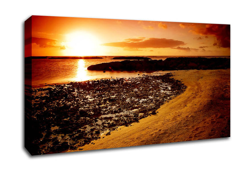 Ochre Ocean Sunset Wide Canvas Print handmade in the UK. Stretched over a 2 inch thick wooden box frame, ready to hang on your wall.