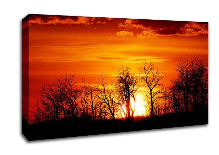 Orange Sunset Treeline Wide Canvas Print handmade in the UK. Stretched over a 2 inch thick wooden box frame, ready to hang on your wall.