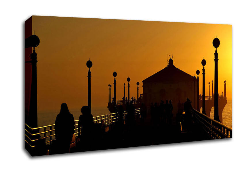 Pier At Sunset Wide Canvas Print handmade in the UK. Stretched over a 2 inch thick wooden box frame, ready to hang on your wall.