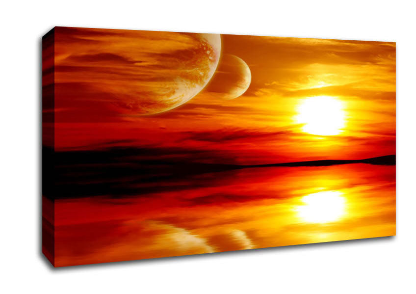 Stunning Planet Sunset Wide Canvas Print handmade in the UK. Stretched over a 2 inch thick wooden box frame, ready to hang on your wall.