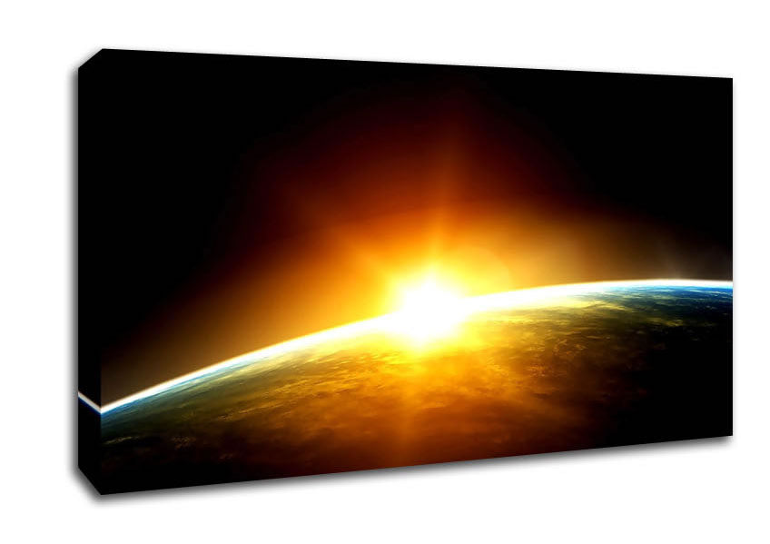 Sunrise Over The Earth Wide Canvas Print handmade in the UK. Stretched over a 2 inch thick wooden box frame, ready to hang on your wall.