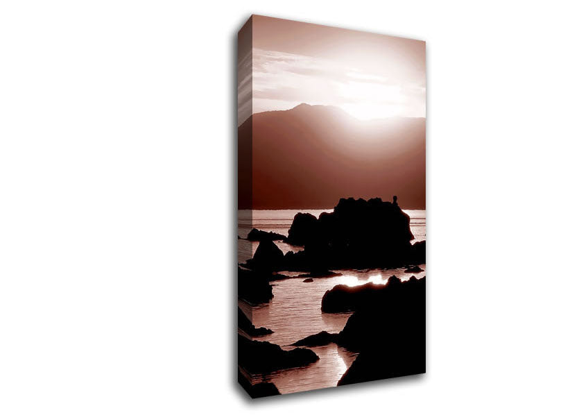The Suns Mauve Ocean Rocks Wide Canvas Print handmade in the UK. Stretched over a 2 inch thick wooden box frame, ready to hang on your wall.