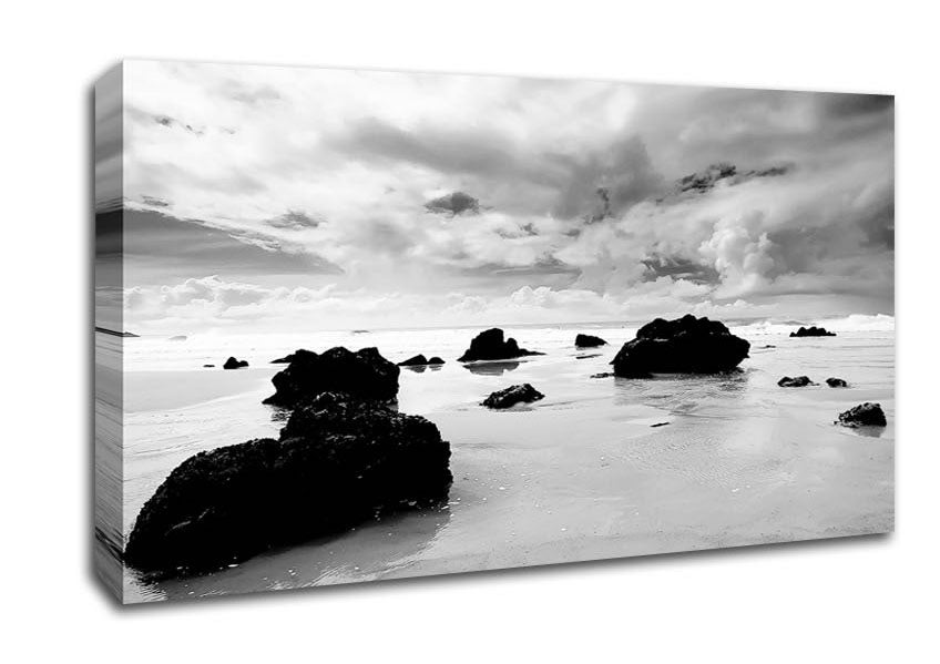 Until The Tide Returns B n W Wide Canvas Print handmade in the UK. Stretched over a 2 inch thick wooden box frame, ready to hang on your wall.