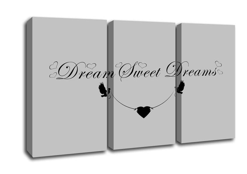 Dream Sweet Dreams Grey 3 Panel Canvas Print handmade in the UK. Stretched over a 2 inch thick wooden box frame, ready to hang on your wall.