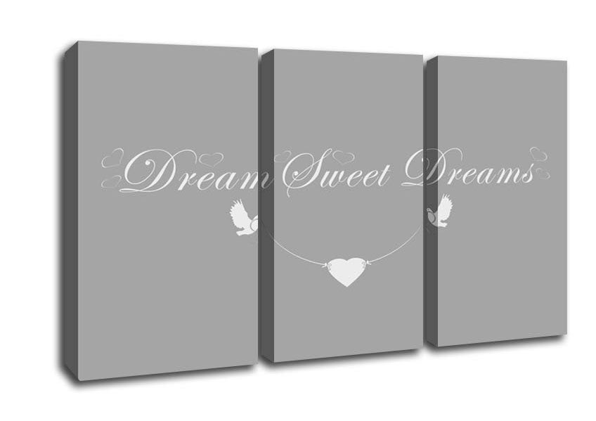 Dream Sweet Dreams Grey White 3 Panel Canvas Print handmade in the UK. Stretched over a 2 inch thick wooden box frame, ready to hang on your wall.