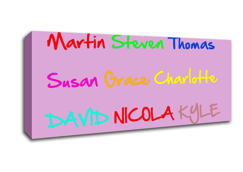 Your Name In A Choice Of Colours Pink Panoramic Canvas Print handmade in the UK. Stretched over a 2 inch thick wooden box frame, ready to hang on your wall.