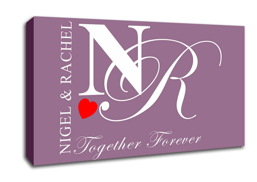 Your Names And Initials Together Forever Dusty Pink Wide Canvas Print handmade in the UK. Stretched over a 2 inch thick wooden box frame, ready to hang on your wall.