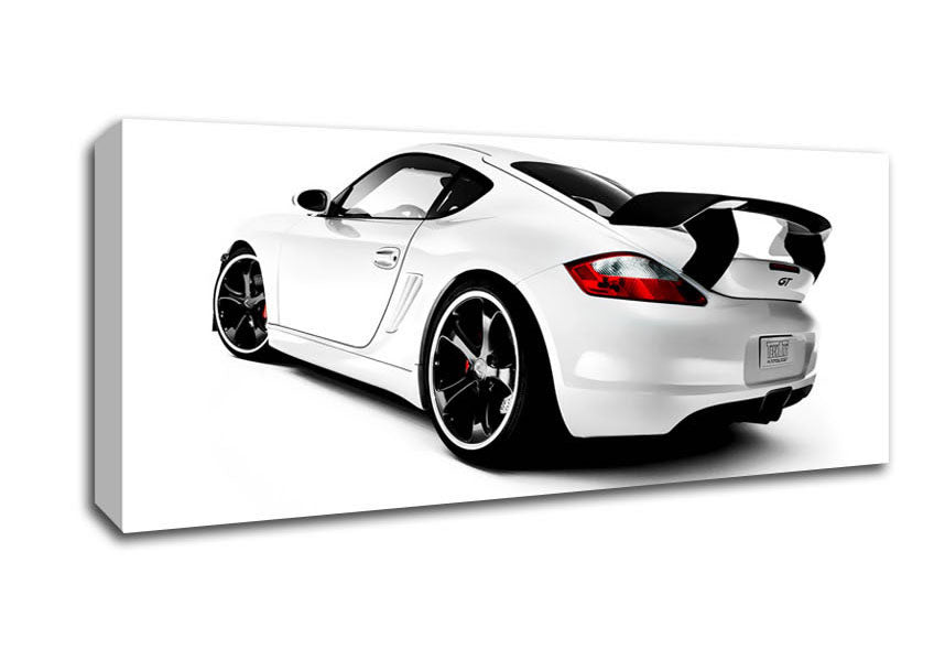 White Porsche Gt Rear Panoramic Canvas Print handmade in the UK. Stretched over a 2 inch thick wooden box frame, ready to hang on your wall.