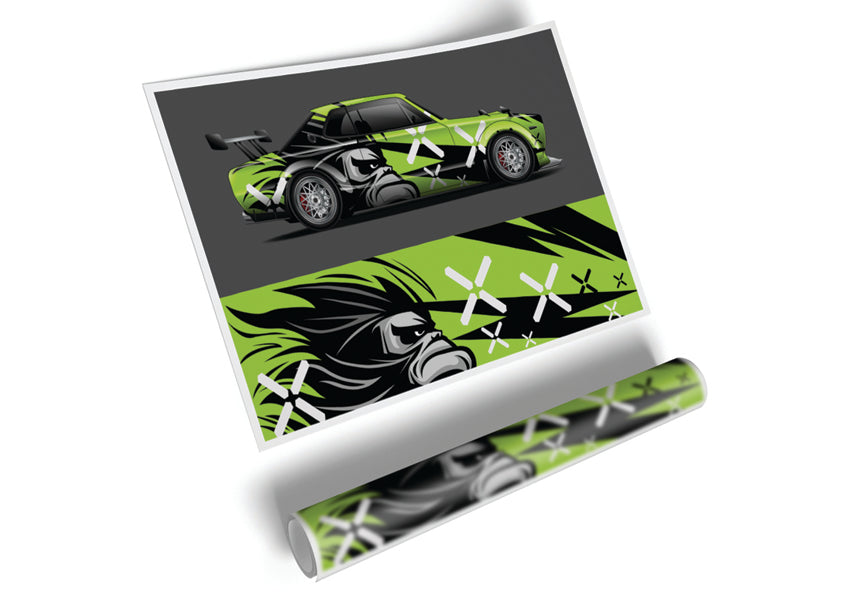 The Green Race Car Poster printed on high quality canvas paper, ready to display.