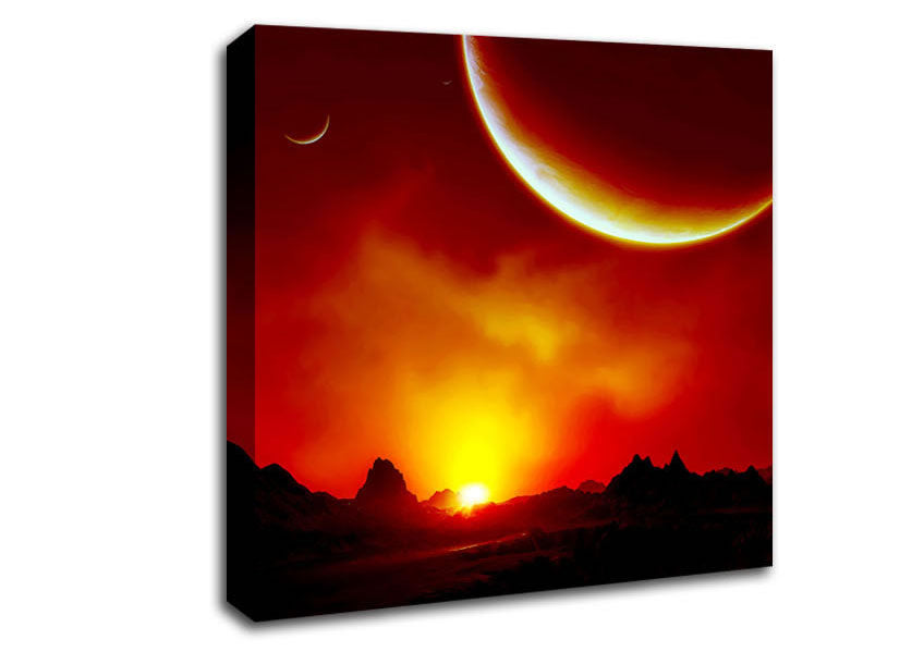 Red Sunrise On Mars Square Canvas Print handmade in the UK. Stretched over a 2 inch thick wooden box frame, ready to hang on your wall.