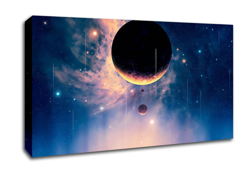 The Solar System Wide Canvas Print handmade in the UK. Stretched over a 2 inch thick wooden box frame, ready to hang on your wall.