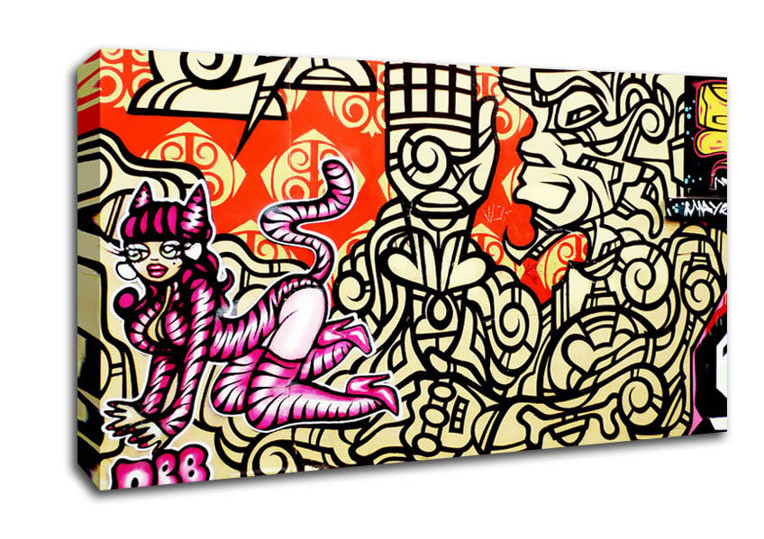 Graffiti Pink Cat Wide Canvas Print handmade in the UK. Stretched over a 2 inch thick wooden box frame, ready to hang on your wall.