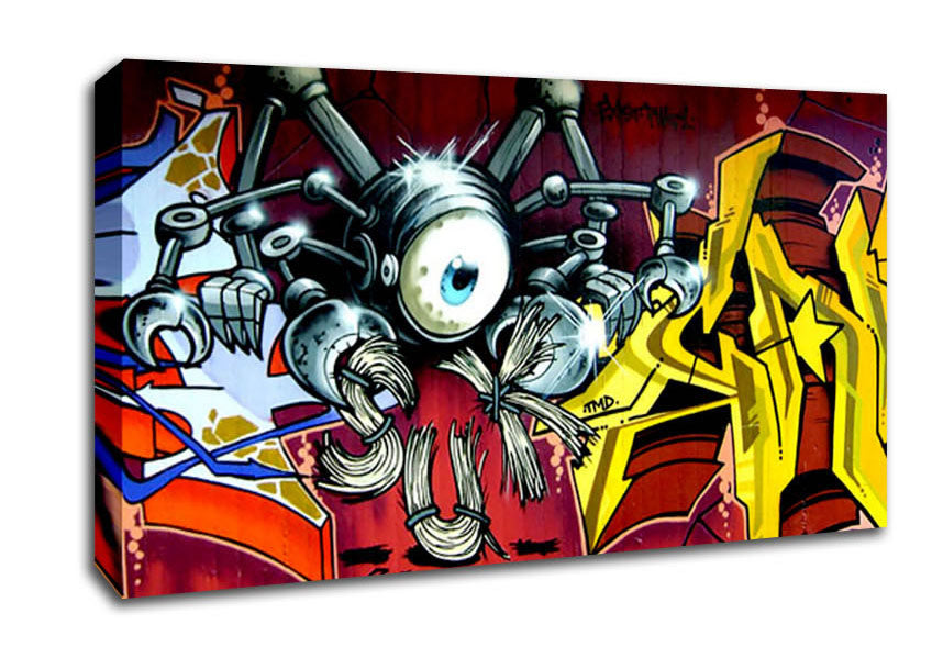 Spider Bot Wide Canvas Print handmade in the UK. Stretched over a 2 inch thick wooden box frame, ready to hang on your wall.