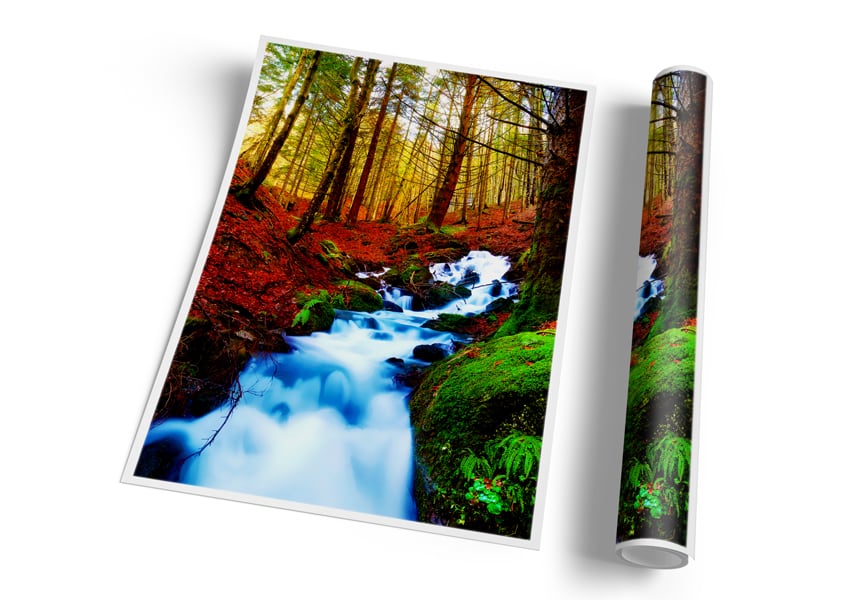 The Autumn Woodland Stream Poster printed on high quality canvas paper, ready to display.