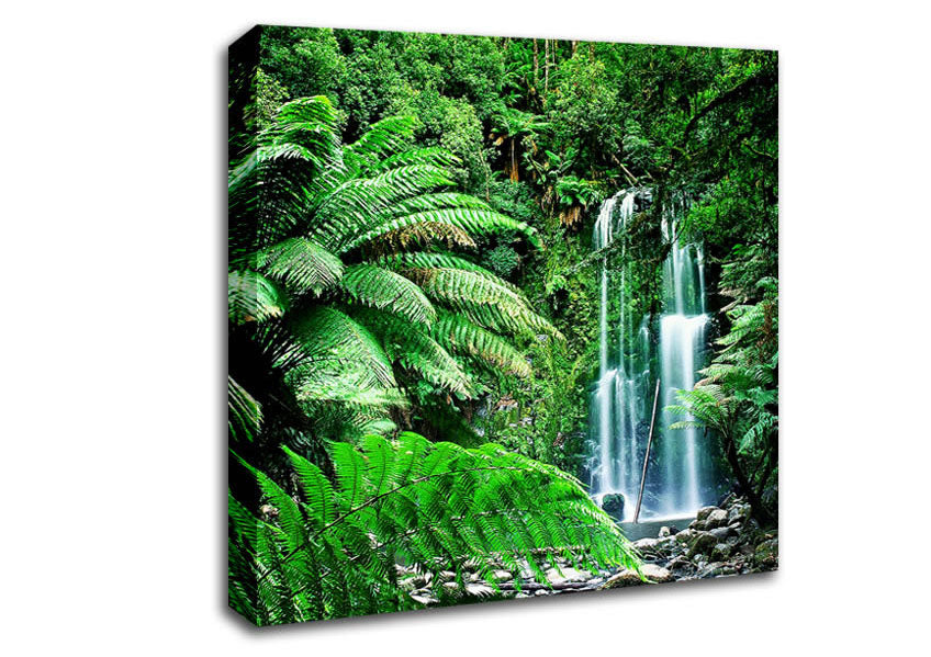 Hidden Woodland Waterfall Square Canvas Print handmade in the UK. Stretched over a 2 inch thick wooden box frame, ready to hang on your wall.